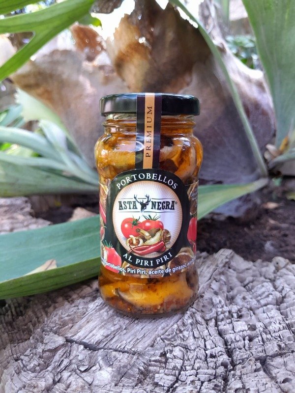 Mezcla conserva de portobellos, Piri Piri, aceite de girasol, aceite de oliva y sal.